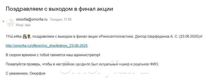 Я так рада, что стала финалистом в акции по ринопластике! Это невероятное счастье и возможность изменить свою жизнь к лучшему. Хочу поблагодарить организаторов акции и врачей за такой шанс.